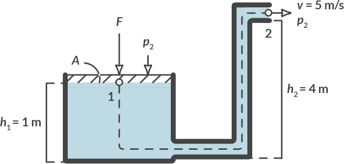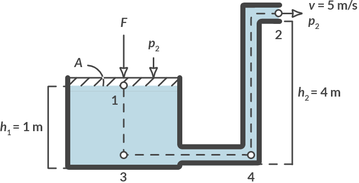 For point 2 we assume that \(p_2 = p_{\textrm{atmosphere}}, v_2 = v \quad \textrm{[m/s]}\) and \(h_1 = 0 \textrm{ [m]}\).