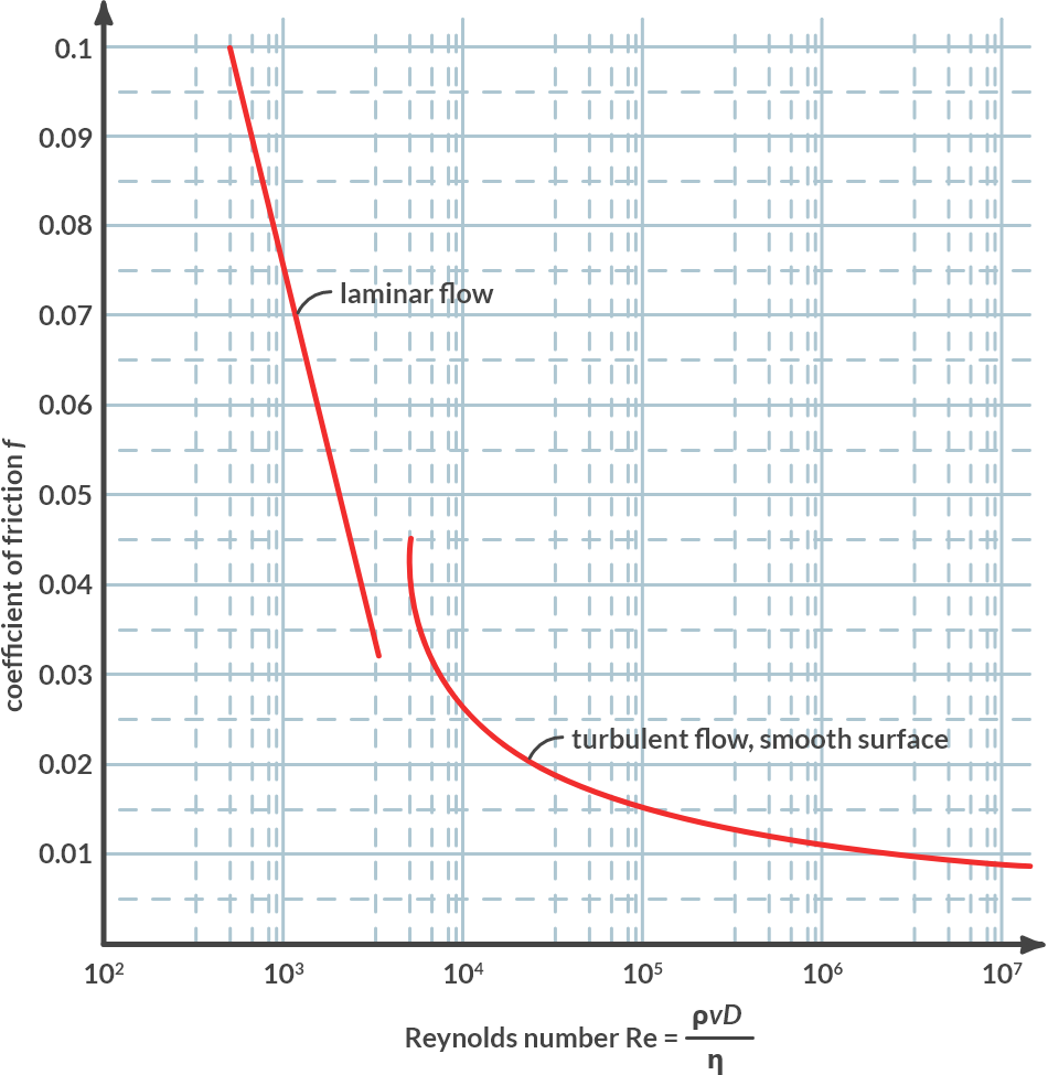 In this equation, the dimensionless Reynolds number Re indicates the ratio between the inertial forces (\(\propto \rho\)) and the resistance forces (\(\propto \eta\)). The flow is laminar if the Reynolds number is less than 2100. For a laminar flow the friction factor is a simple function of the Reynolds number, namely \(f = \frac{64}{Re}\). The pressure drop is linear depending on the velocity and the power required to move the liquid is equal to the product of the pressure drop and volume flow.