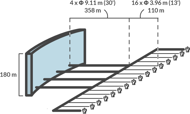 The starting point for our estimate is the diagram from Fig. 3.13 of the plant. The water first falls over a height of 180 m. After arriving at the bottom it flows through 4 pipes, each 358 m long. Then each line divides into four. The 16 lines of 110 m eventually lead to so-called Francis turbines, which convert the movement of the water into rotational energy, which is converted into electricity by generators.