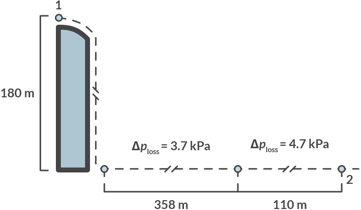 For point 1 we assume that \(p_1 = p_{\textrm{atmosphere}}, v_1 = 0 \quad \textrm{[m/s]}\) and \(h_1 = 180 \textrm{ [m]}\).