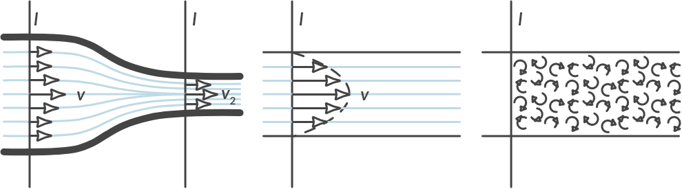 Flows in a gas or in a liquid are often described with the help of streamlines. Streamlines show how the gas or liquid particles move. Now consider the flow through a pipe section. If we neglect friction, the speed of all particles on line \(I\) (perpendicular to the streamline) is the same. We call this flow laminar frictionless flow (Fig. 3.2(a)).