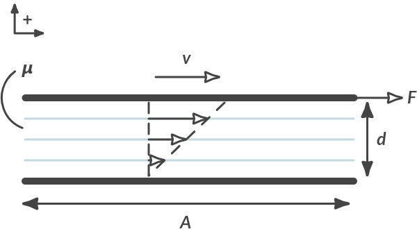 With, \(F\) the necessary force in \([\textrm{N}]\), \(A\) the contact surface in \([\textrm{m}^2]\), \(v\) the velocity of the upper plate [m/s], \(d\) the thickness of the fluid layer in [m] and \(\eta\) the viscosity of the liquid in [Pa·s].