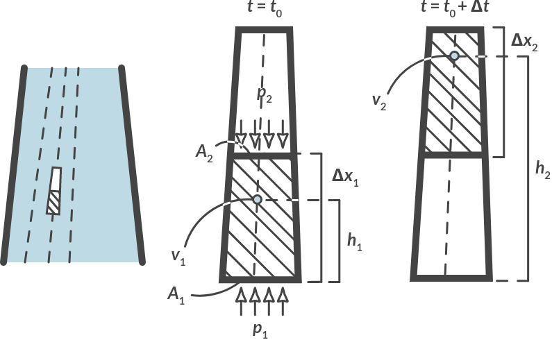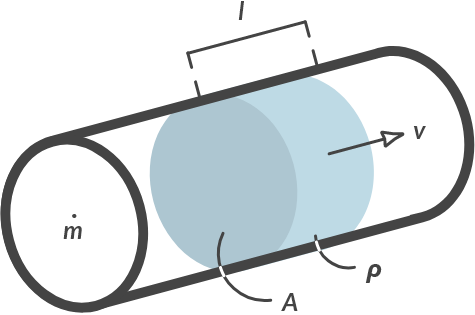 In which \(\dot{m}\) (pronounced “m-dot” or fluxie m) is the mass flow in [kg/s], \(\rho\) the density of the flowing medium in \([\textrm{kg/m}^3]\), \(A\) is the cross-section of the pipe in \([\textrm{m}^2]\) and \(v\) the flow speed in [m/s]. It is assumed that \(\rho\) (incompressible, therefore non-compressible, liquid) and \(A\) (non-deformable pipe) are constant. The volume flow \(\Phi_v = A \cdot v\) \([m^3/s]\) indicates the displaced volume of liquid.