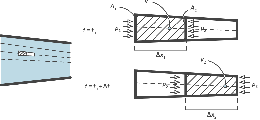 A mass element in a stationary flow moves over a streamline. We look at one such mass element at two moments, at \(t = t_0\) and at \(t = t_0 + \Delta t\). The velocity of the mass particle increases because the cross section decreases (continuity equation). This change in velocity is also related to a pressure difference.