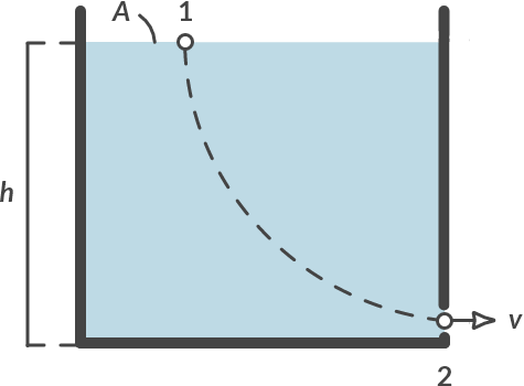 We choose points 1 and 2 on a streamline. If the outflow opening is small enough, a mass particle at point 1 must pass point 2. The following applies: